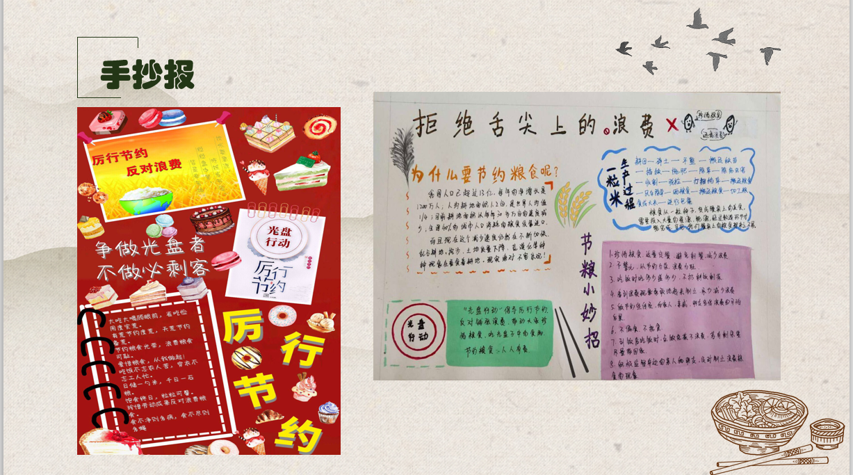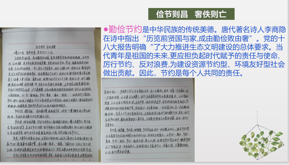 通過觀看厲行節約紀錄片,手寫倡議書,畫手抄報的形式,使學生明白節約是一種美德,節約是一種智慧,節約更應該是一種習慣和風氣。建設節約型社會需要全社會的共同參與和共同行動,找回失去的節約意識,從節約一滴水,節約一度電,節約一張紙,節約一粒米開始,持之以恒,在建設節約型社會中,將節約這個“傳家寶”進一步發揚光大。全民行動,推行節約,身體力行,杜絕浪費。