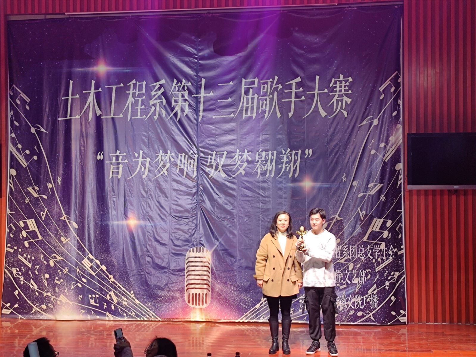 11月30日晚,由土木工程系團總支學生會主辦、土木工程系文藝部承辦、安徽交院廣播協辦的第十三屆歌手大賽在北區八角樓舉行。比賽在文藝部女生青春洋溢的串燒舞蹈中開場。經過三輪激烈的比賽環節,以及三位專業評委老師綜合評比之后,1號選手金凱同學最終斬獲冠軍,土木工程系黨總支副書記朱蓉老師為其頒發了象征著榮譽的冠軍獎杯。最后,由十三位參賽選手深情演唱的《那些你很冒險的夢》,引發了全場大合唱,比賽至此圓滿結束。