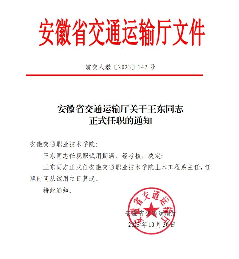 安徽省交通運輸廳關于王東同志正式任職的通知