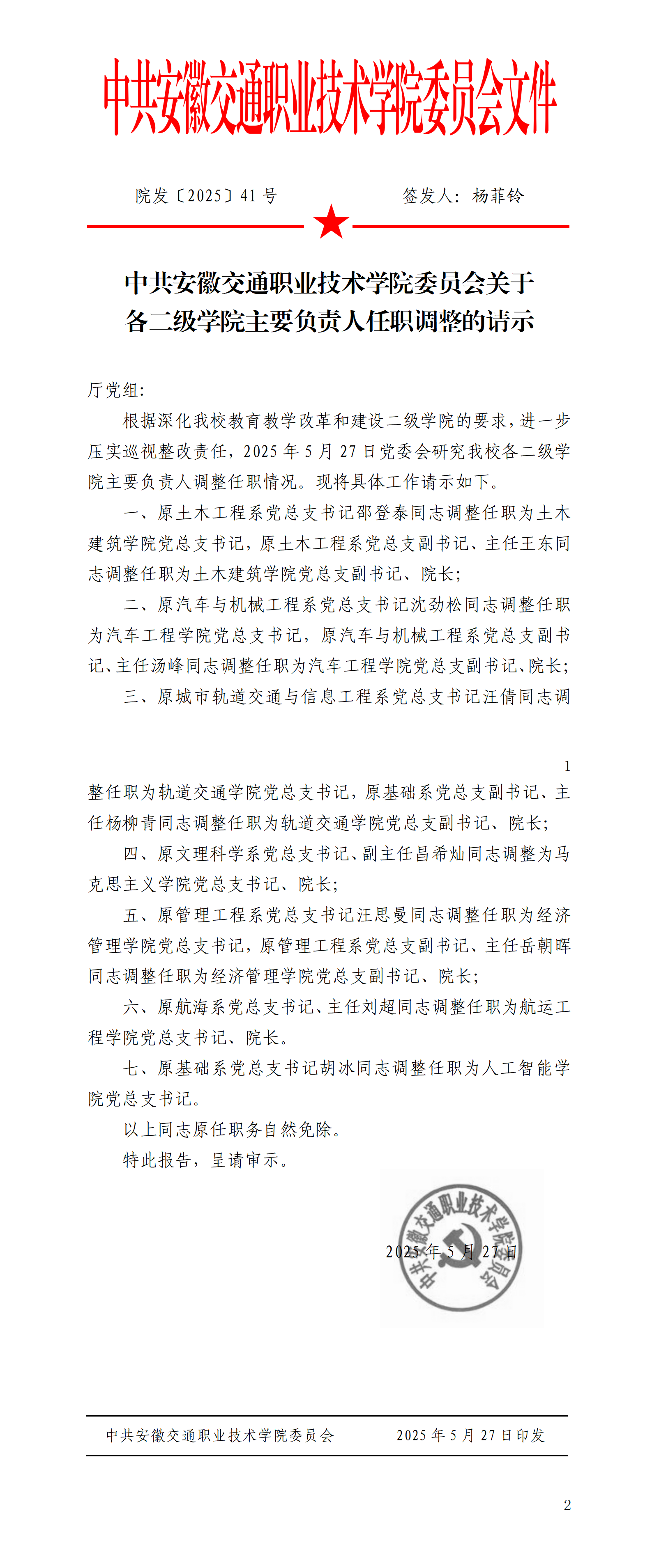 中共安徽交通職業(yè)技術(shù)學院委員會關(guān)于各二級學院主要負責人任職調(diào)整的請示